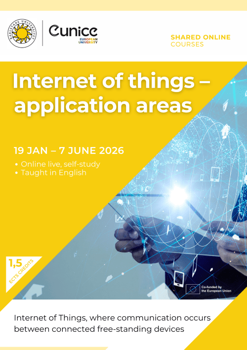 The course covers the Internet of Things, where communication occurs between connected free-standing devices, rather than between humans and machines. The focus of the course is small, resource-saving devices such as sensors for measuring, steering of regulators, and communication between them.